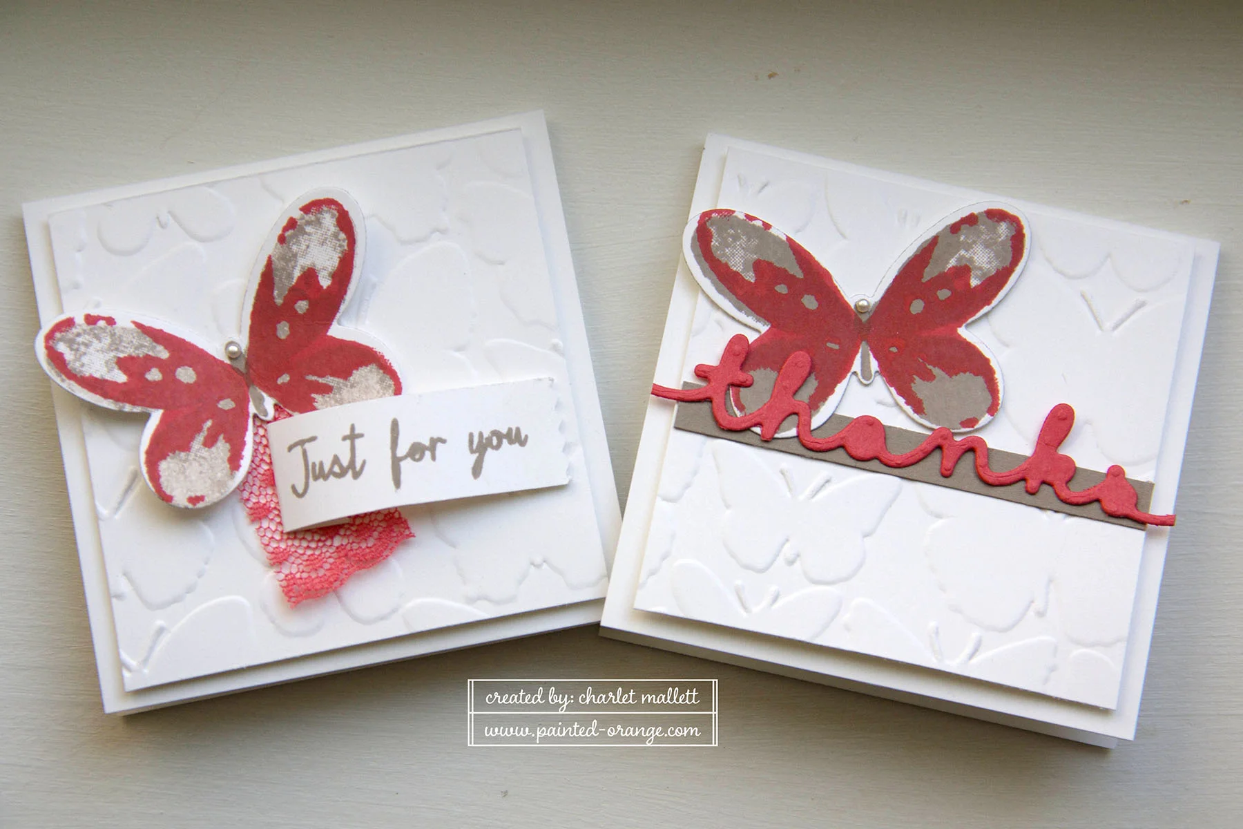 Small notecards are super fast and easy to make. I am participating in an organized 3x3 swap for Stampin' Up!'s upcoming convention. It's taking me a bit of time to come up with a cute 3x3 swap that will be easy to mass produce. These two butterfly cards did not make the cut but are still pretty cute for an outtake.