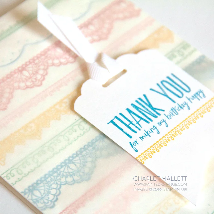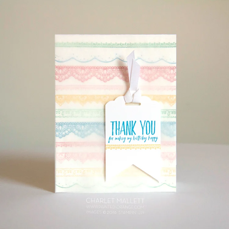 My card today uses every image in the stamp set. That doesn't happen very often, like almost never! I stamped each border in an alternating color to create the background on the card. Boy did the colors really pop! I wanted to mute them down a bit for a softer look so I added a glassine sheet over the top. I love the super soft effect the glassine created.