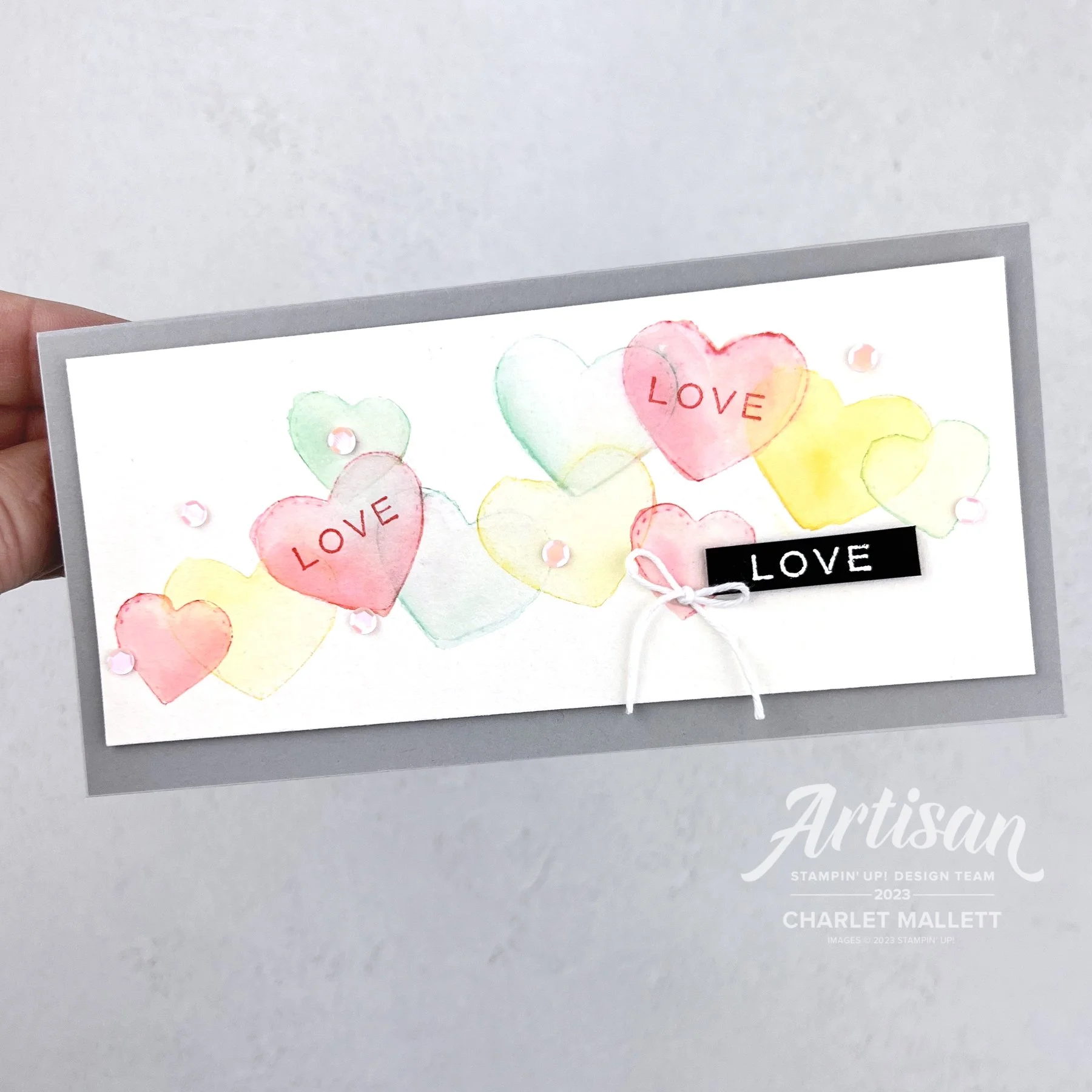 That reel inspired me to try something similar with dies. I tried to stamp with dies. It was a bit tricky, messy and not as easy as I would of hoped but I kept with it and came up with this card. I used the small heart dies from the Give It a Whirl dies, these were the only heart dies I had (use what you have). The LOVE stamp is from the Fragrant Flowers stamp set and works great as a sentiment on a conversation heart. You can see this cardmaking attempt in my instagram reels.
