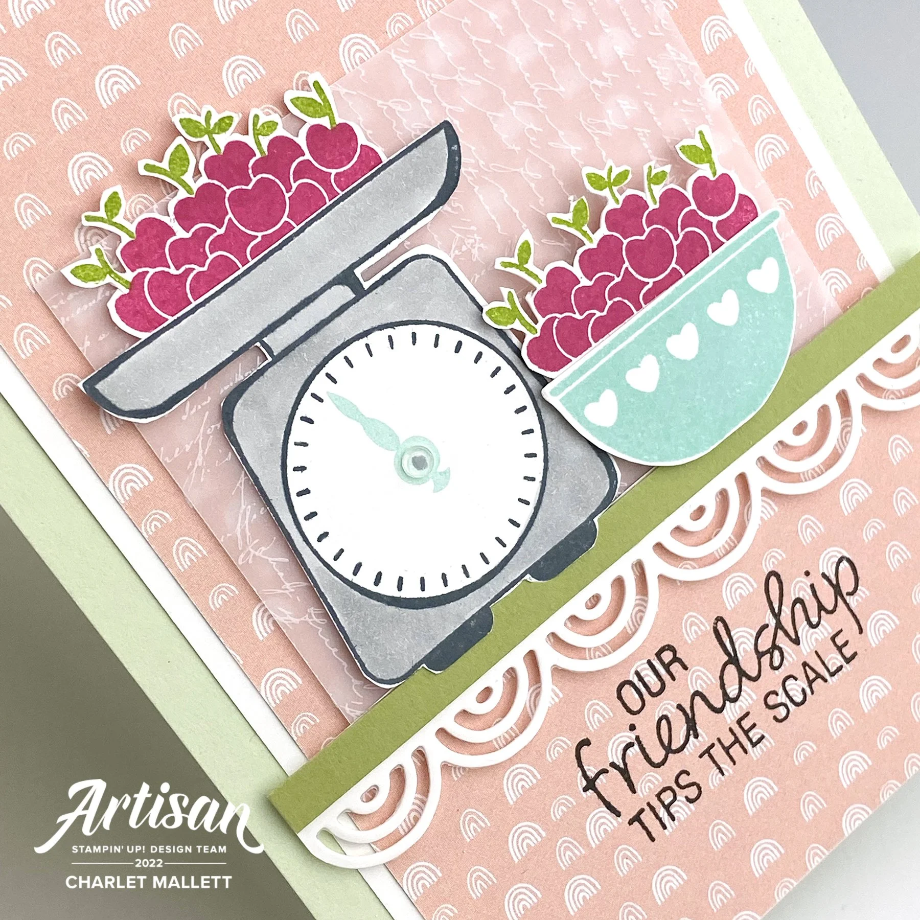 Hello friends! Welcome to the Measure of Love Edition of Stamp Review Crew. This is a short and sweet hop and I have one sweet card to share. This card is all about the stamping. The bowl is stamped in Pool Party. Apple or Cherries are in Magenta and the scale has been colored using Stampin’ Blends. All three images have been hand cut and arranged on the card front to mimic a kitchen counter scene. I love that this set can be used for a friend VALENTINE.