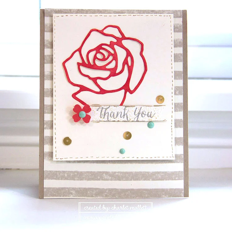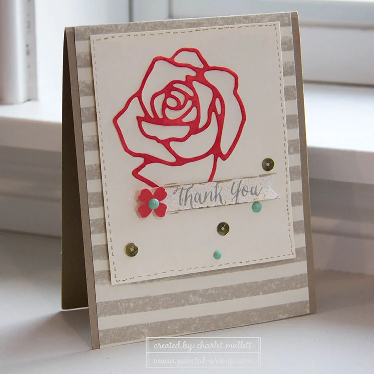 A note about this card ... I likely won't be recreating anytime soon. I had this great idea to use the negative spaces from the large rose thinlet as the primary image for my card. I really love the look of this but, boy, it was a time suck. It also uses a fair amount of foam adhesive or Stampin' dimensionals.