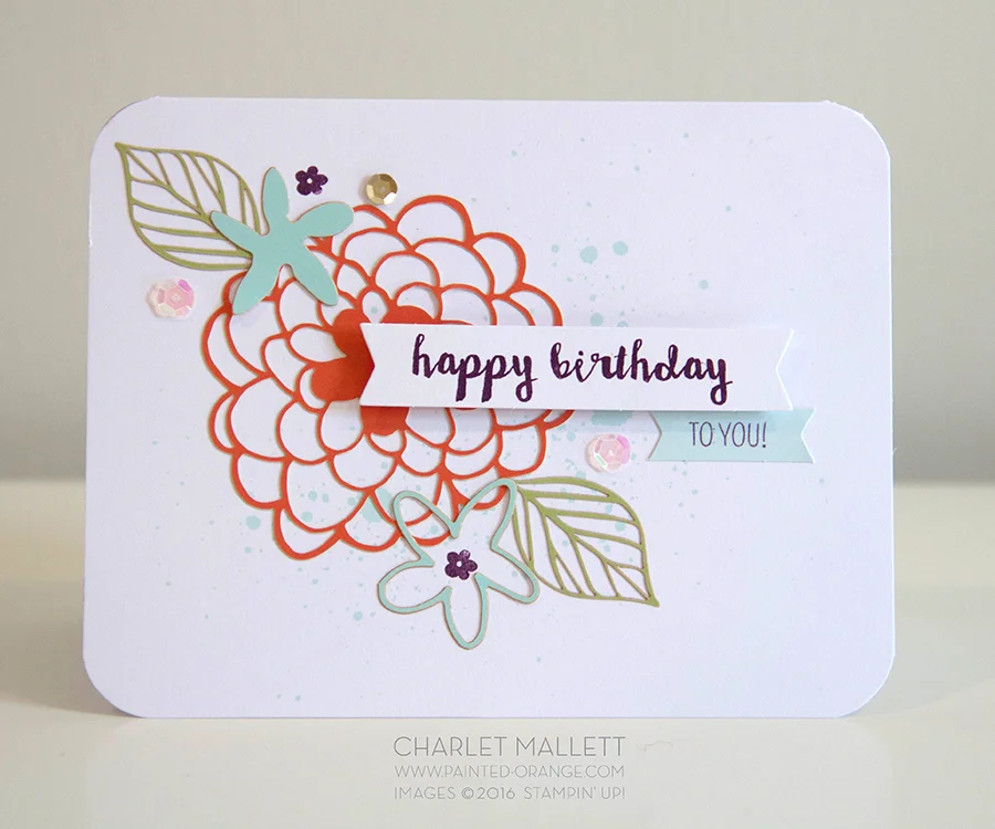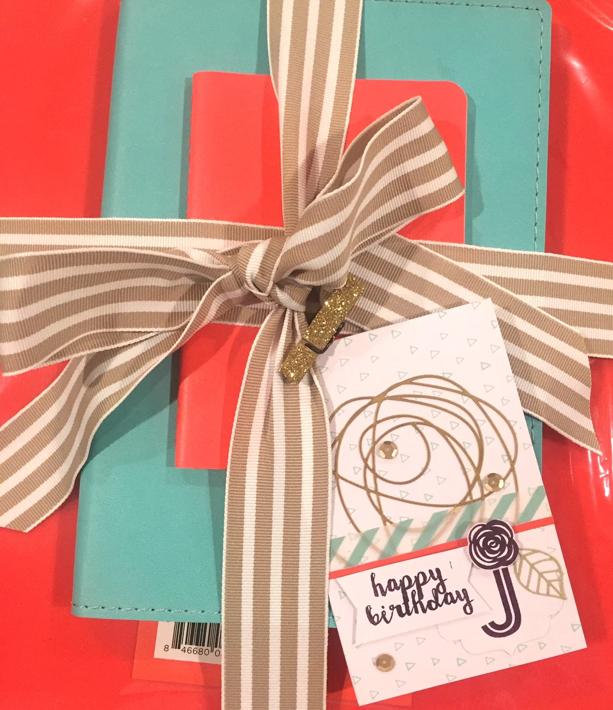 I needed a birthday tag for a gift I was wrapping. Somehow my gift contents matched the colors in this kit exactly so I decided to tie up the contents with a simple striped ribbon and attach the tag. The presentation is so matchy, matchy and I love it. I pulled in the Metro Type alphabet stamp set to add a little customization to the tag with a J, and dotted the J with the flower from the kit stamp set. I attached the tag with a gold glittered clothespin. Fun stuff.